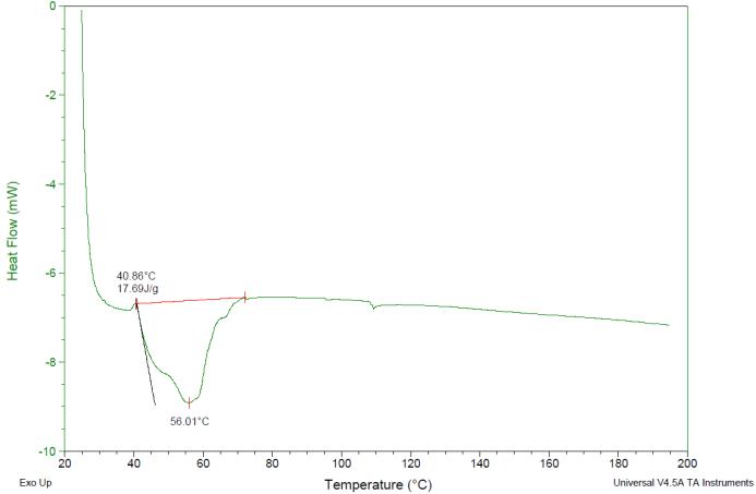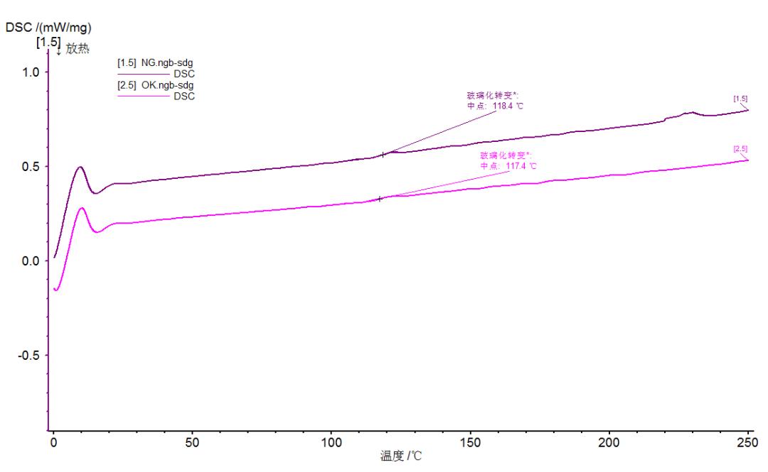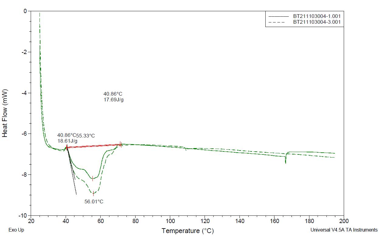 我们得到:这两款样品的DSC图谱在40~70°C范围内重合度较差;