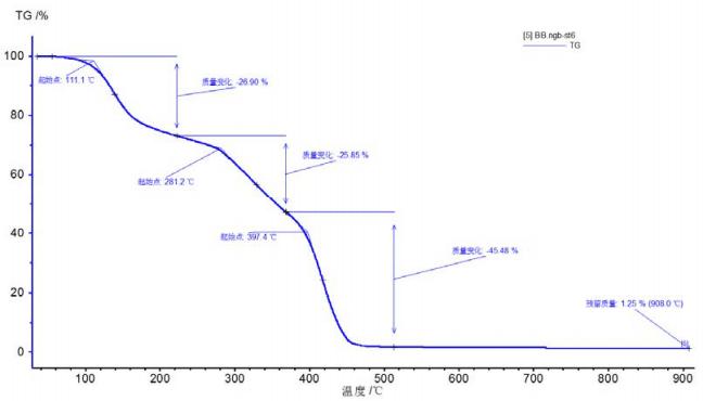 TGA法(热重分析法),其原理是测量样品质量随温度或时间的变化关系。高聚物一般都有其特定的分解温度,不同阶段表示不同组分的分解,温度从低到高依次为小分子物质(水分,有机添加剂等)分解,高聚物分解,无机物的分解(炭黑,碳酸钙的分解),*后为残余的灰分(主要是材料中的无机添加剂或其分解产物)。不过不同升温程序的设置,其分解物的类型会有所差别。